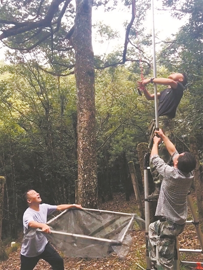 | 保护站的工作人员正在百山祖主峰南坡海拔1760米处采集百山祖冷杉的种子。 记者潘仙德 摄 |