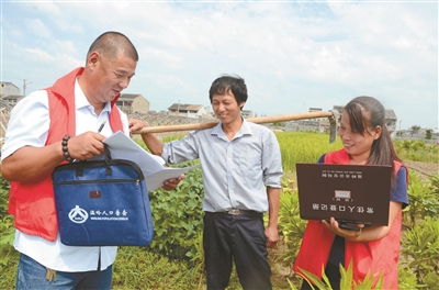 9月1日,在温岭市滨海镇滨兴村,普查员们冒着烈日在田间地头对村民进行人口普查前的摸底登记。