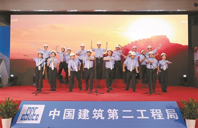 | 项目部工人自编自演的大合唱《咱们工人有力量》,把活动推向高潮。 记者邹伟锋 摄 |