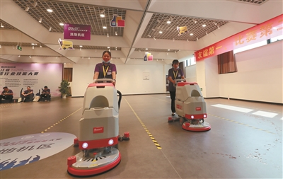 | 参赛选手在洗地机区比拼技能。 记者邹伟锋 摄 |