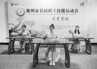 日前,衢州市举办首届职工技能运动会,全市共有15个集体比赛项目,591名选手参赛。其中最吸引人眼球的是茶艺比赛。经层层选拔,全市共有35名选手参赛。选手要分别经过理论考试、规定茶艺比赛、自创茶艺比赛和高级茶艺师自创茶艺考核。经过激烈比拼,衢州醉根酒店有限公司朱晓芬勇夺桂冠,并荣获“衢州市金牌职工”和“衢州市技术能手”称号。图为茶艺比赛场景。毛朝阳 姚磊 摄影报道