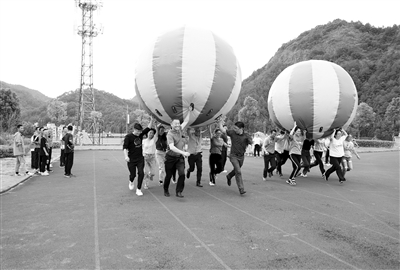 近日,庆元县职业高级中学利用课外活动时间举行教职工趣味运动会。全校教职工以团队的形式开展了“人桥接力”“龙舟竞速”“不倒森林”“运转乾坤”等趣味竞技项目的比赛。教职工在辛苦工作之余得到放松和娱悦,无形中提高了教职工的凝聚力和向心力。图为教职工正在参加“运转乾坤”项目的比赛。