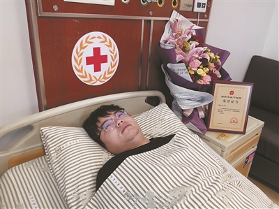 | 图为汪夕健完成造血干细胞采集后在床上休息。 |