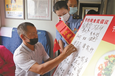 | 旅客们在节约粮食倡议展板上签字承诺。 通讯员沈克勤、骆友竹 摄 ▲ 摄 |