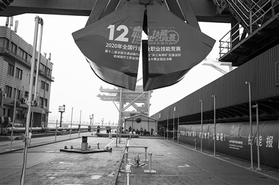 10月22日,第十二届全国交通运输行业“浙江海港杯”起重装卸机械操作工职业技能大赛在宁波舟山港举行。图为选手在门式起重机比赛中进行“定点投篮”,选手精湛的技艺引来声声喝彩。通讯员蒋晓东 摄