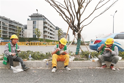 一盒快餐、三两工友就着马路牙子席地而坐。这是近日中午,记者在杭州市余杭区绿汀路和文二路交叉口看到的“露天午餐”一幕,一位来自衢州的建筑工人告诉记者,他们是旁边绿城房产项目工地上的工友,因项目部食堂距离工地较远,且饭菜价格较贵,多数工友选择路边快餐解决吃饭问题。俗话说:“人是铁,饭是钢。”记者呼吁我省建设建筑企业要从吃、住入手,切实关心关爱建筑行业工人,共同构建和谐社会。记者邹伟锋 摄