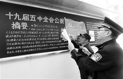 日前,80岁的台州市路桥区路桥街道田洋王村老党员叶春海和派出所社区民警一起绘制党的十九届五中全会公报黑板报。老党员叶春海退休后,20年来坚持不懈在社区绘制黑板报,向群众传递党和政府的声音。