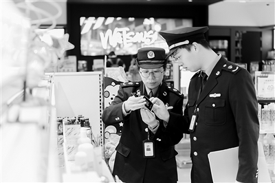 图为该局执法人员在一家化妆品经营单位,检查化妆品商标标签标识及对应的索证索票资料等。