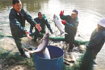 昨日清晨,渔民正在建德市更楼街道后塘村湖岑塘水库的水面上采用拖网的方式拦网捕鱼,当日共捕获鲢鱼、鲫鱼、鳊鱼等鲜鱼5000多公斤,销往温州等水产市场。