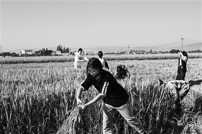 蓝蓝的天空下是成片成片的金色稻田,浙江工商职院电子商务学院学生陈颖站在稻田里,顶着阳光,弓着身子,一手紧握稻子根部,一手拿着镰刀,用力一割,才勉强把稻秆子割断。不一会儿,汗水便湿透了她的发梢。