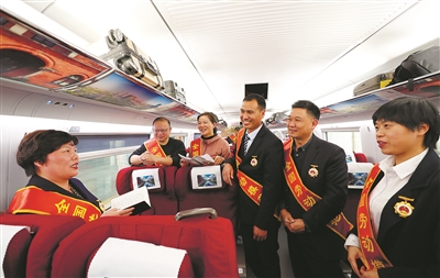 11月24日下午,在返浙“西子号”高铁上,全国劳模方青(左一)、徐玲玲(左三)向同车厢的劳模共同分享表彰大会的笔记,跟大家一同学习习近平总书记在大会上的重要讲话精神。 记者邹伟锋 摄