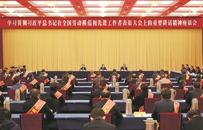 | 昨日上午,我省举行学习贯彻习近平总书记在全国劳动模范和先进工作者表彰大会上的重要讲话精神座谈会。 记者邹伟锋 摄 |