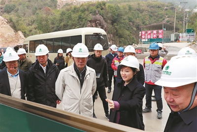 | 史济锡(左前三)在浙江缙云抽水蓄能电站建设现场详细了解工程进展及立功竞赛开展情况。 记者邹伟锋 摄 |