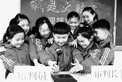 近日,在湖州市德清县乾元镇中心小学教室里,孩子们在“模拟法庭”上进行“庭审”。