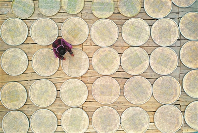 图为近日村民在晾晒粉皮干(无人机照片)。