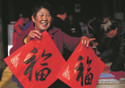 日前,诸暨市同山镇边村村举办乡村邻里节,村民们一起学唱村歌、观看文艺演出、分享美食,其乐融融,一派邻里和谐景象。图为村民展示当地书法协会志愿者为她写的“福”字。