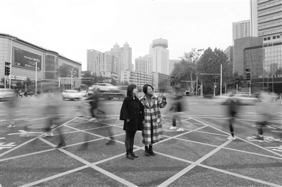| 站在繁华的武汉循礼门,王丽霞(右)和王莉回忆年初空旷的街道。 |