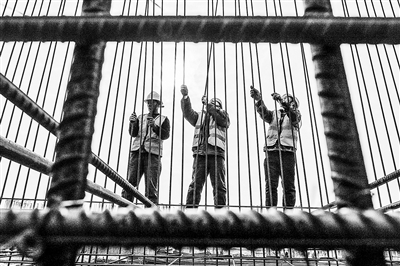 图为工人在杭温高铁台州市仙居永安溪特大桥桥墩上扎钢筋。