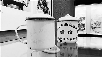 两个白色的搪瓷杯,不少地方已经泛起了斑斑铁锈,但杯子上面的红色字体依然清晰可见。在杯子的最下方,还印有“杭州市工人文化宫”的字样。