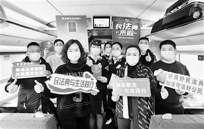 2021年1月1日,《中华人民共和国民法典》正式实施。近日,在中国铁路集团上海局集团公司杭州客运段值乘的G590次列车上,列车职工在工作间隙,向旅客宣传《民法典》,与旅客一同学习《民法典》,与法同行。