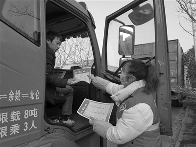 | 志愿者向集卡司机发放“北仑境内旅游景点清单”。 |