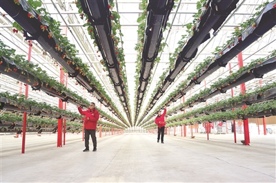 昨日,在杭州建德市草莓小镇的杨村桥智慧大棚里,管理人员正在立体无土栽培、动态数据监控的草莓架上采摘鲜红的果实。