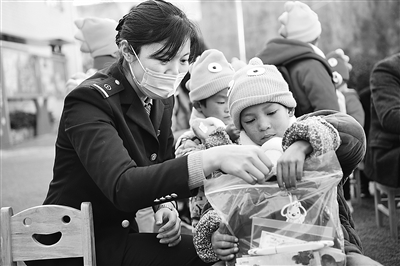 “叔叔阿姨”们下车后,搬来了大型玩具、桌椅、书包和书本,并给小朋友们戴上御寒的帽子和围巾。转眼间,操场粗糙的水泥地被柔软的地垫取代,破旧的滑梯焕然一新,学习的桌椅也换了模样。