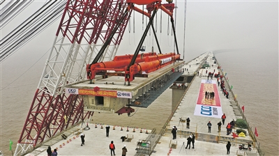 昨日上午,在东海的万顷碧波中,随着重达1800多吨的70米箱梁被海上大型浮吊缓缓地放在舟岱大桥主通航孔北边跨处的高墩上,标志着宁波舟山港主通道项目实现主线贯通。