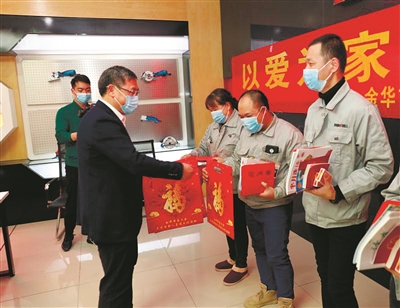 据了解,春节前夕,金华市县两级工会筹集资金200余万元,上门慰问留金过年的“新金华人”,同时开展一系列的送文化进企业活动,在企业、工地、乡村等地送书籍、送法律、送春联,让“新金华人”在“第二故乡”过一个有温度的春节。图为金华市总工会党组书记、副主席兰景贵正在慰问“新金华人”。通讯员黄刚 摄