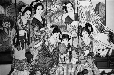 这幅名为《琴棋书画图》的十字绣,绣制的“十二金钗”和6名侍女姿态各异、服饰鲜艳,一针一线之下,可谓栩栩如生。