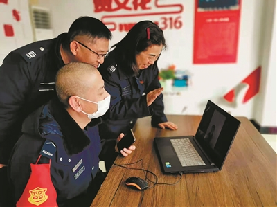 | 公交司机李珠课(戴口罩者)与家人视频连线。 胡翀 摄 |