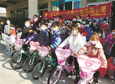 一辆儿童自行车、一块电话手表、一套装满文具的勤学福袋……2月2日上午,玉环市龙溪镇政府大院里,50名留在玉环过年的“小候鸟”收到了玉环市总工会、龙溪镇总工会赠送的新年礼物,圆梦微心愿,开开心心在第二故乡过新年。