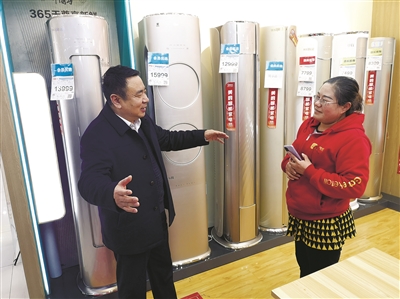 | 张兆都(左)问候浙江国美电器留浙过年的销售员。 |