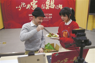 本报讯 通讯员丁凯摄影报道 戴上乌毡帽,尝尝蒸双臭,今年不回家,云端“医”起过大年。2月3日,一场别出心裁的线上直播活动在绍兴市人民医院举行。院工会为了给外地员工营造浓厚的过年氛围,让他们安心留在“浙”里过大年,特别策划了“以院为家,留绍过年”为主题的线上文化活动,通过“学说绍兴话”“品尝绍兴菜”等线上互动游戏和文娱节目向外地员工介绍绍兴的过年民俗和特色饮食,让他们不但感受到单位的温暖,而且更好地了解绍兴、融入绍兴,安心地留在绍兴过年。