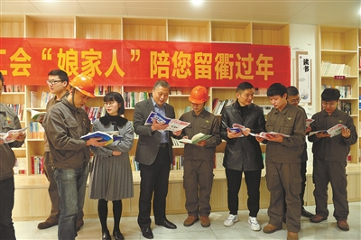 图为衢州市总工会干部与留衢过年的外地员工在职工阅览室一起阅读工会赠送的书刊。