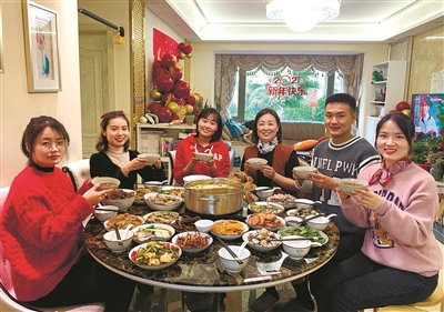 包饺子,剪窗花,写对联……为了给来自五湖四海的留杭“大孩子”们一份别样的温暖,杭州市安华幼儿园工会精心准备了一顿“家的味道”年夜饭,在除夕盛情邀请留杭过年的“大孩子”们一起吃“喜悦”,品亲情!一桌丰盛的年夜饭,吃出幸福的味道,享受团圆的美好。通讯员管馨娜 摄