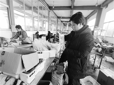 | 陈序红(右)精心挑选送给职工的大礼包。 |