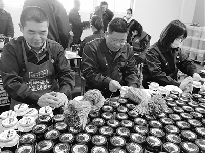 在湖州老恒和酿造有限公司的车间,工会干部职工与企业职工一起工作,干得热火朝天,打包纸箱、放货、搬运……整个流程有条不紊地开展。