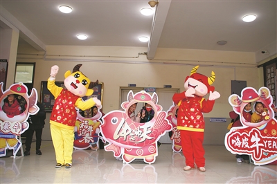 2月27日是舟山市中小学学生新学期报到的日子。当天上午,普陀区六横中心小学举行了一场以“牛气冲天、犇向未来”为主题的新学期学生报到仪式,安排了两个“牛娃娃”迎接同学们,并特制了“牛气冲天”画框,让同学们合影留念,校园里处处呈现喜庆的新年氛围。