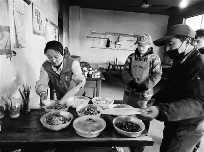| 周晓庆(左)给外来留杭垓过年的职工送年夜饭。 |