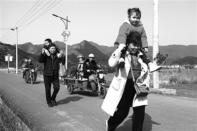 图为几位村民正走在崭新而平坦的通村公路上,脸上露出了幸福的笑容。徐曙光