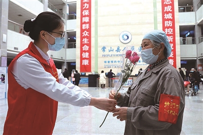 “三八节”到来之际,常山县人民医院为院内保洁阿姨们送上鲜花。她们虽不是医生、护士,不能治病救人,但她们是医院的“美容师”,用默默无闻的工作,为大家带去整洁光亮的环境。