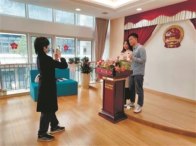 | 新人们在领取结婚证后拍照留念。 记者张浩呈 摄 |