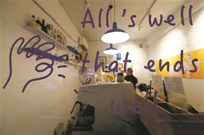 | 店门左手边玻璃窗上写着“All’s well that ends well”,你知道这是什么意思吗?(答案可在本版寻找) |
