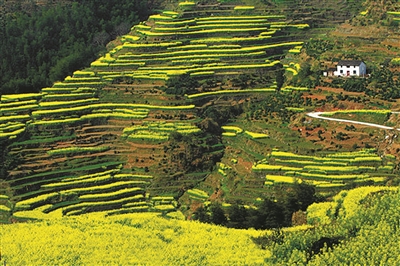 胥岭梯田 胥岭村距乾潭镇20公里,四周群山环抱,空气清新,景色迷人。这里有3000多年的历史遗迹,随处可见为纪念伍子胥而命名的桥、亭、水,如胥峰亭、胥乐泉、子胥桥等。每年3月,海拔800多米的胥岭自然村,层层叠叠的梯田铺满金黄的油菜花,从山脚到山腰有500余层,仿佛置身童话世界。