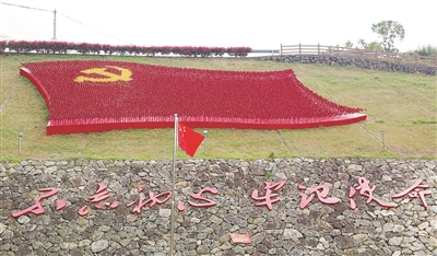 近日,在玉环市龙溪镇“山里红”党群志愿服务广场上,由7100盏红色风车组成、足有400平方米的大幅党旗迎风招展。