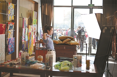 昨日上午,在位于桐庐县横村镇的中国围巾城内,一名主播在直播间介绍推荐外贸品牌针织产品。