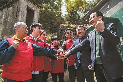 3月23日,在金华市婺城区沙畈乡革命老区一座老旧电力配电房前,28年前参与过当地电网建设的电力职工和青年志愿者一起手握手,传承奋斗精神。