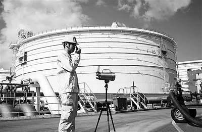 图为岙山基地技术人员正在库区使用实用新型专利产品移动式防爆视频监控设备。