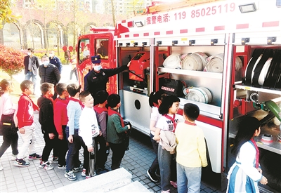 昨日,义乌市福田专职消防队将消防车开进义乌复旦实验学校,通过车内器材装备展示、安全课堂、灭火器讲解体验等形式,为全校700名师生开展校园消防安全培训。通讯员陈文青 摄